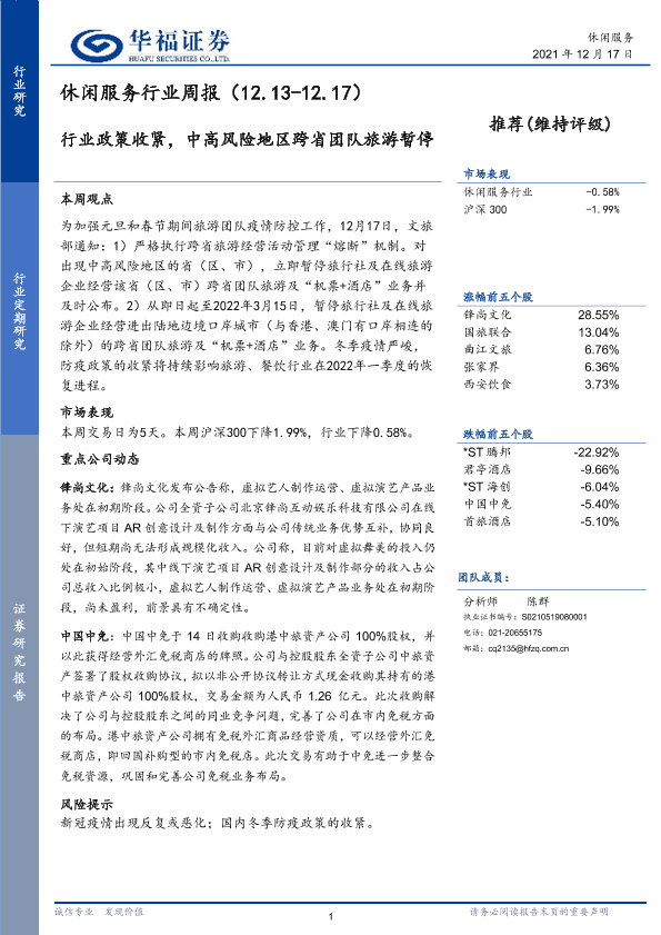 【华福证券】【20211217】休闲服务行业周报:行业政策收紧,中高风险地区跨省团队旅游暂停-5页