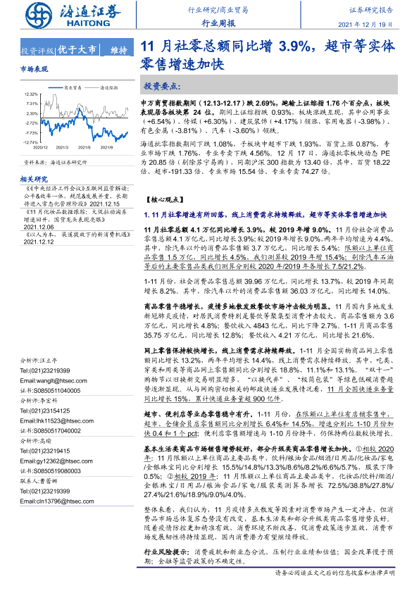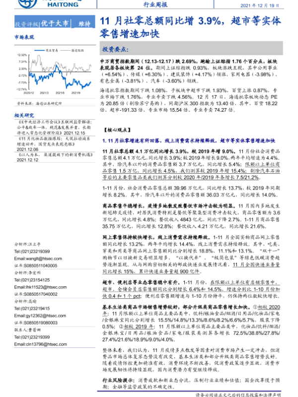 【海通证券】【20211219】商业贸易行业周报:11月社零总额同比增3.9%,超市等实体零售增速加快-6页