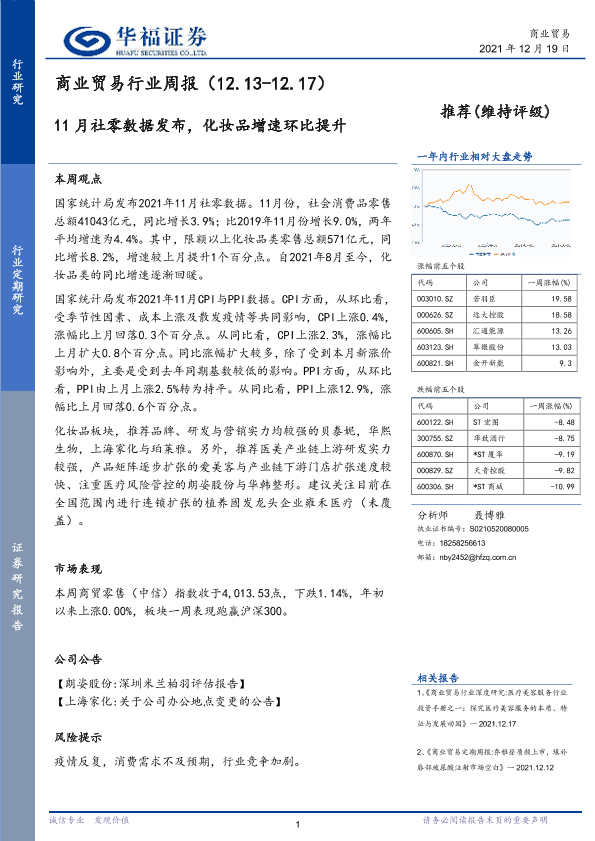 【华福证券】【20211219】商业贸易行业周报:11月社零数据发布,化妆品增速环比提升-8页