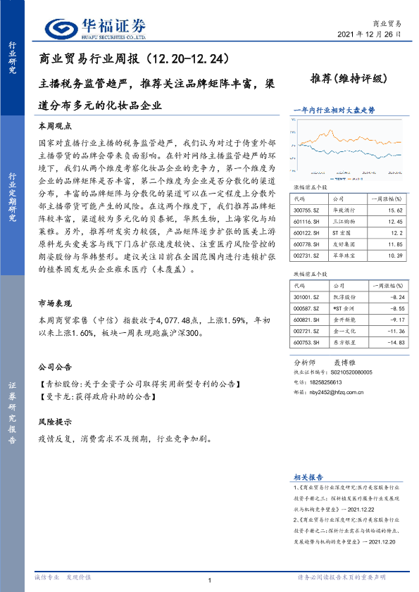 【华福证券】【20211226】商业贸易行业周报:主播税务监管趋严,推荐关注品牌矩阵丰富,渠道分布多元的化妆品企业-7页