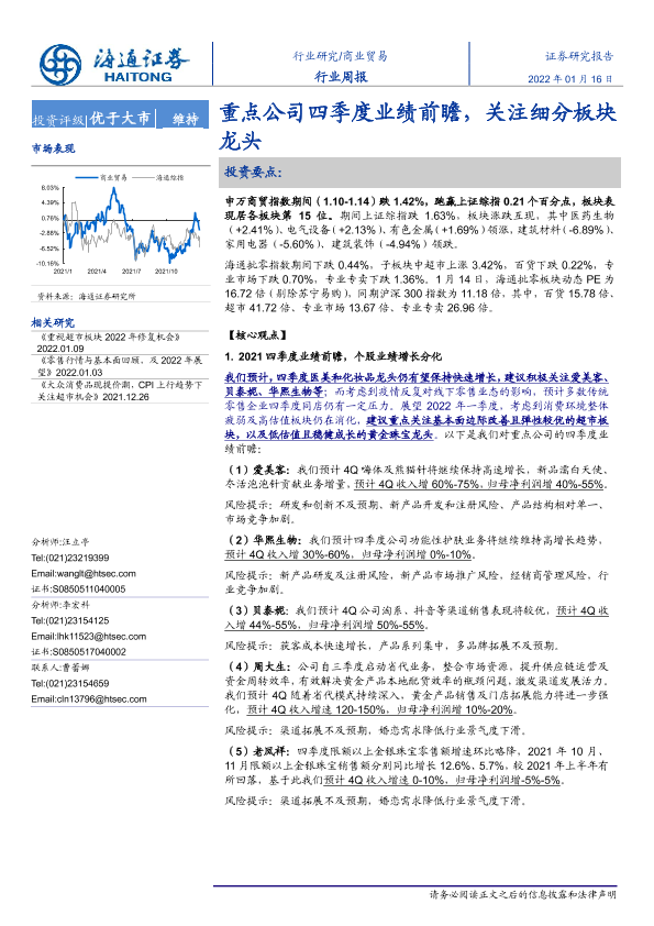 【海通证券】【20220116】商业贸易行业周报:重点公司四季度业绩前瞻,关注细分板块龙头-8页