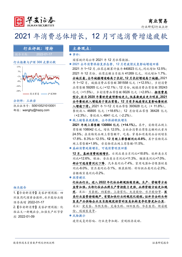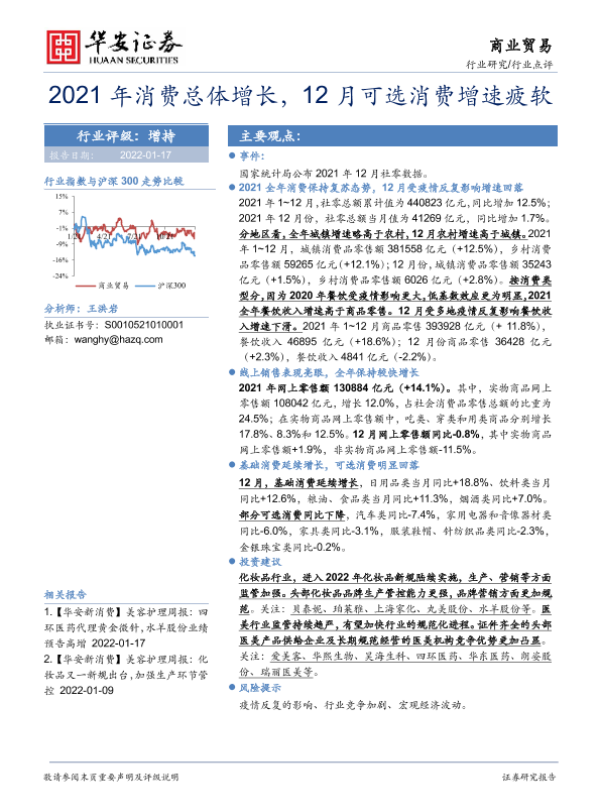 【华安证券】【20220117】2021年消费总体增长,12月可选消费增速疲软-2页