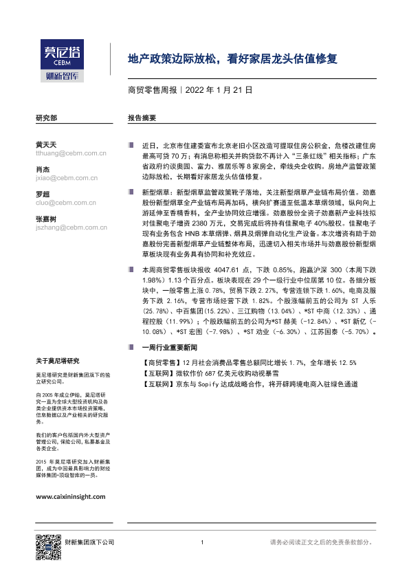 【莫尼塔研究】【20220121】商贸零售周报:地产政策边际放松,看好家居龙头估值修复-6页