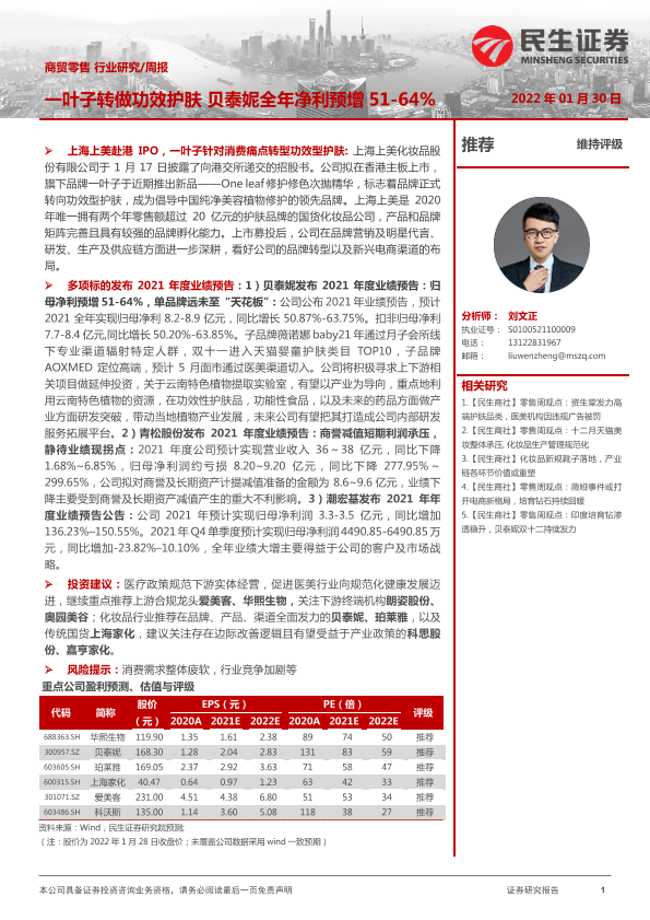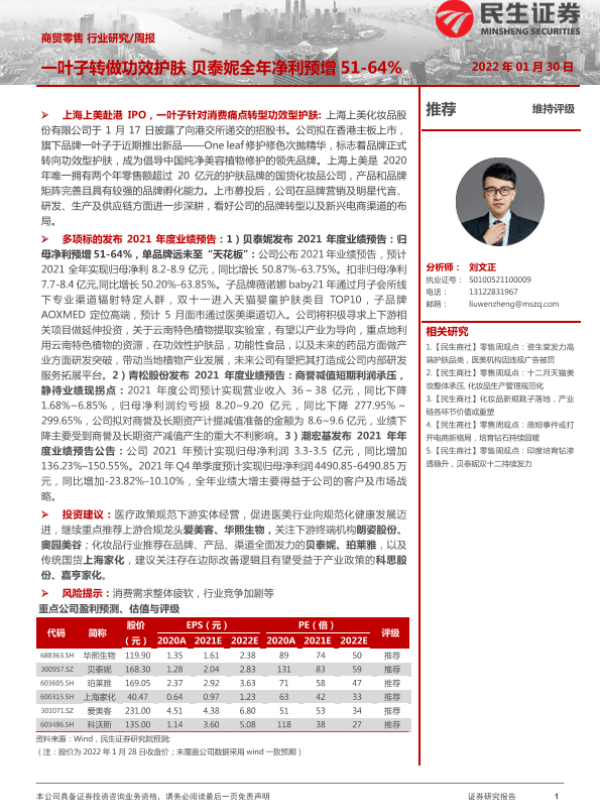 【民生证券】【20220130】商贸零售行业周报:一叶子转做功效护肤 贝泰妮全年净利预增51-64%-21页