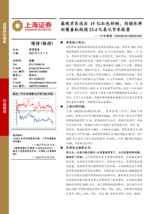 【上海证券】【20220207】商贸零售行业周报:春晚京东送出15亿红包好物,刘强东将向慈善机构捐23.4亿美元京东股票-14页