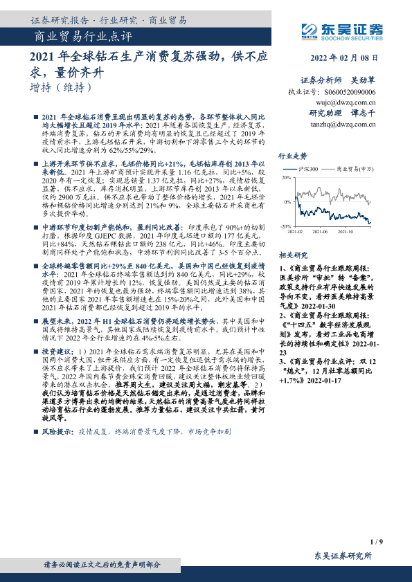 【东吴证券】【20220208】2021年全球钻石生产消费复苏强劲,供不应求,量价齐升-9页