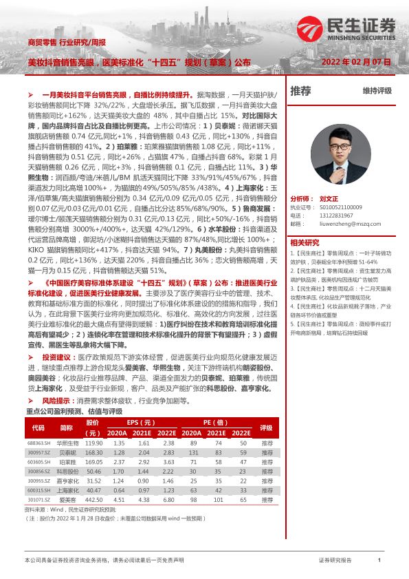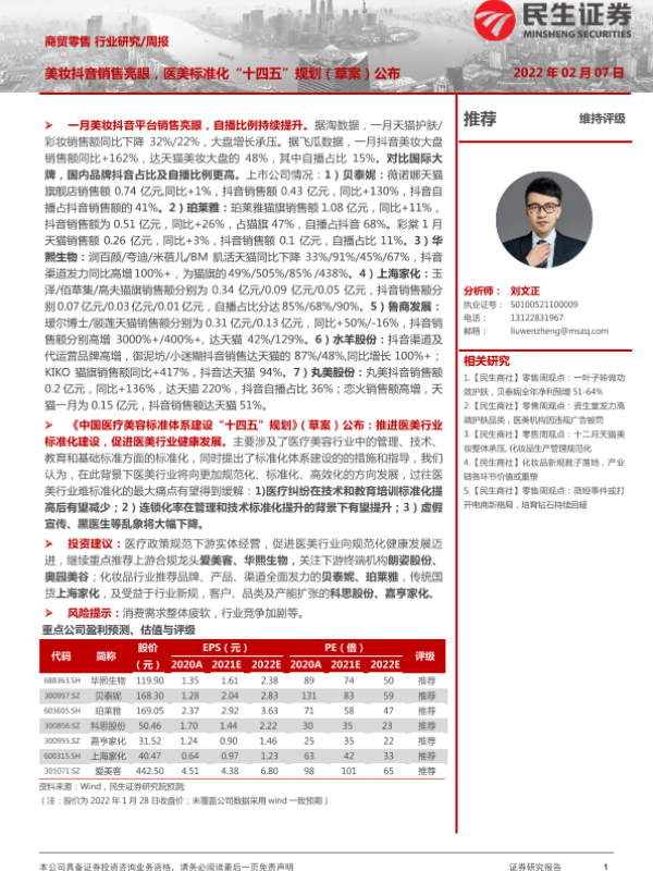 【民生证券】【20220207】商贸零售行业研究周报:美妆抖音销售亮眼,医美标准化“十四五”规划(草案)公布-21页