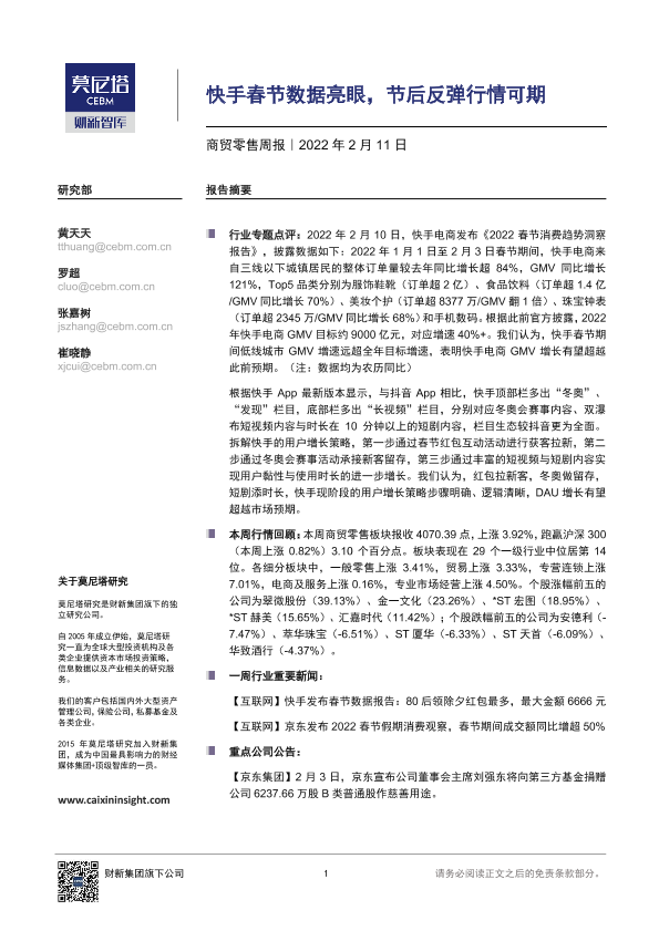 【莫尼塔研究】【20220211】商贸零售周报:快手春节数据亮眼,节后反弹行情可期-7页