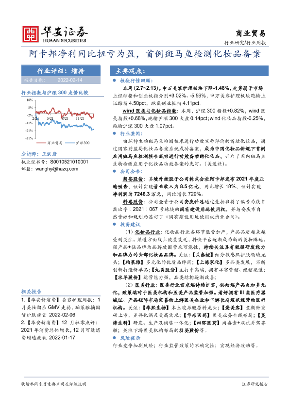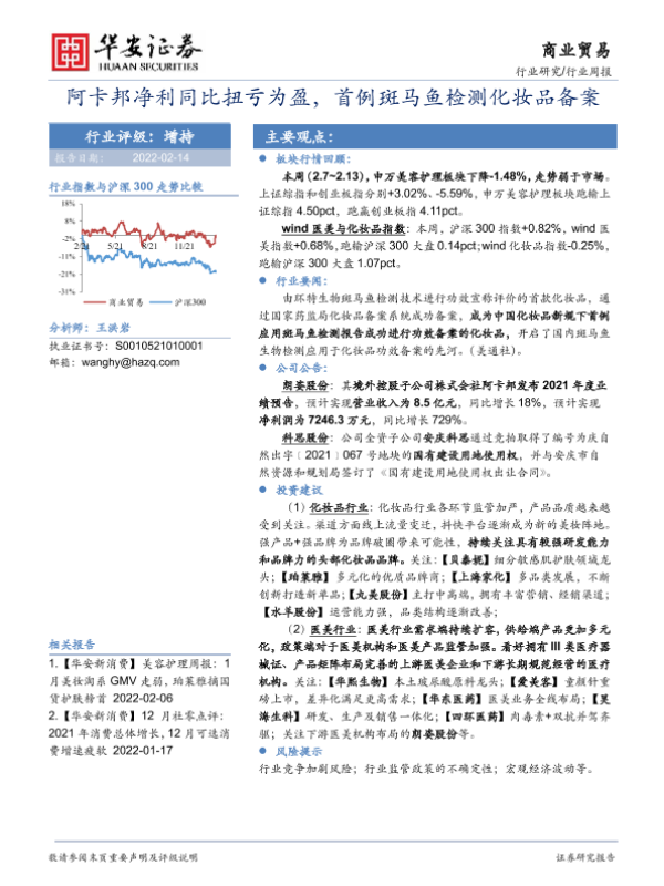 【华安证券】【20220214】商业贸易行业周报:阿卡邦净利同比扭亏为盈,首例斑马鱼检测化妆品备案-15页