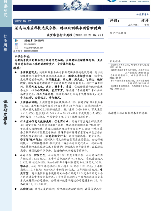 【国泰君安证券】【20220226】商贸零售行业周报:菜鸟与店匠科技达成合作,腾讯内测鹅享团首涉团购-9页