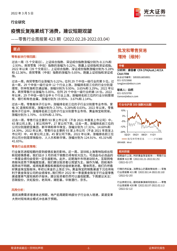 【光大证券】【20220305】零售行业周报第423期:疫情反复拖累线下消费,建议短期观望-8页