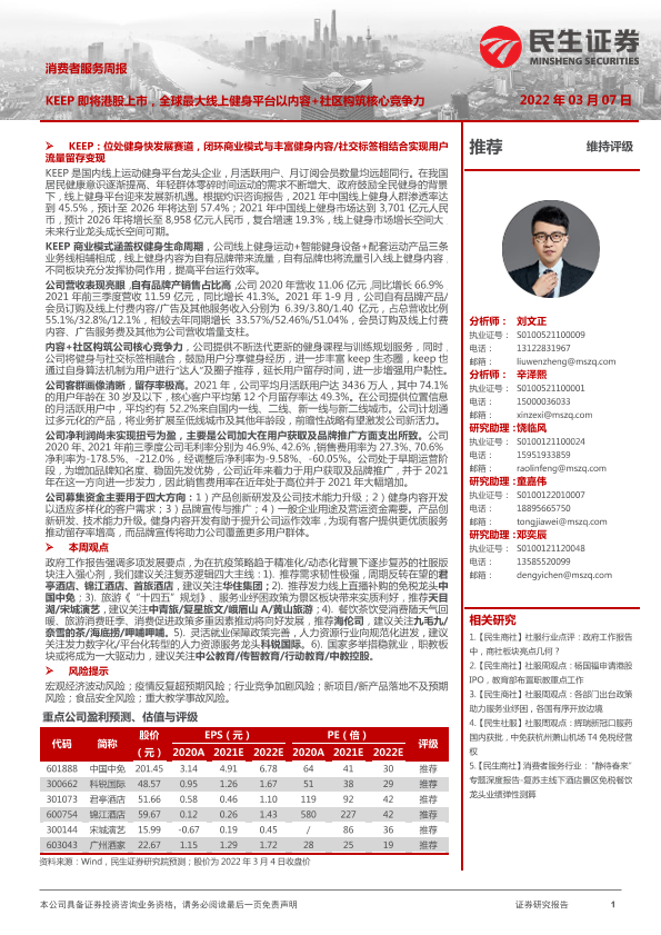 【民生证券】【20220307】消费者服务周报:KEEP即将港股上市,全球最大线上健身平台以内容+社区构筑核心竞争力-36页