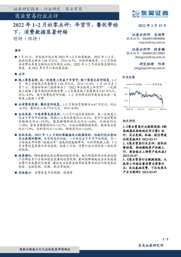 【东吴证券】【20220315】2022年1~2月社零点评:年货节、餐饮带动下,消费数据显著好转-5页