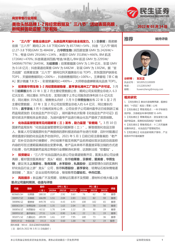 【民生证券】【20220314】商贸零售行业周报:美妆头部品牌1-2月经营数据及“三八节”活动表现亮眼,新规解答助监管“软着陆”-24页