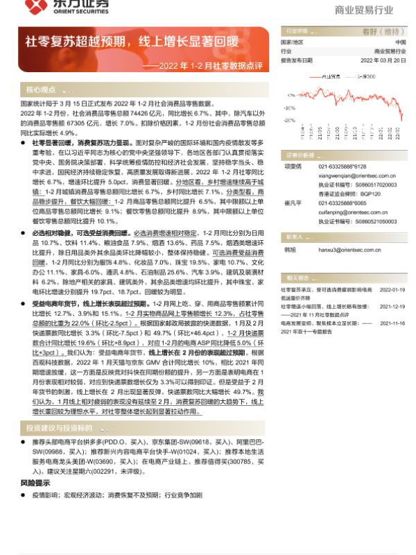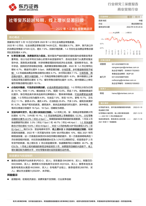 【东方证券】【20220320】2022年1-2月社零数据点评-社零复苏超越预期,线上增长显著回暖-15页