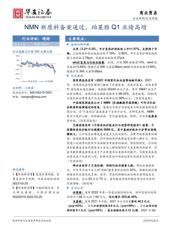 【华安证券】【20220327】商业贸易行业周报:NMN新原料备案通过,珀莱雅Q1业绩高增-18页