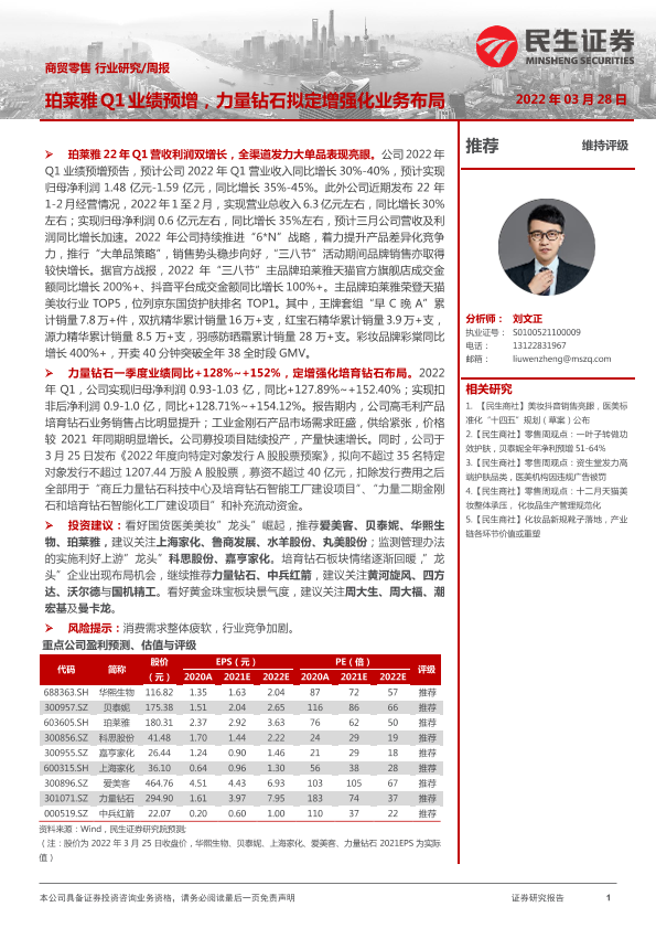 【民生证券】【20220328】商贸零售行业研究周报:珀莱雅Q1业绩预增,力量钻石拟定增强化业务布局-18页