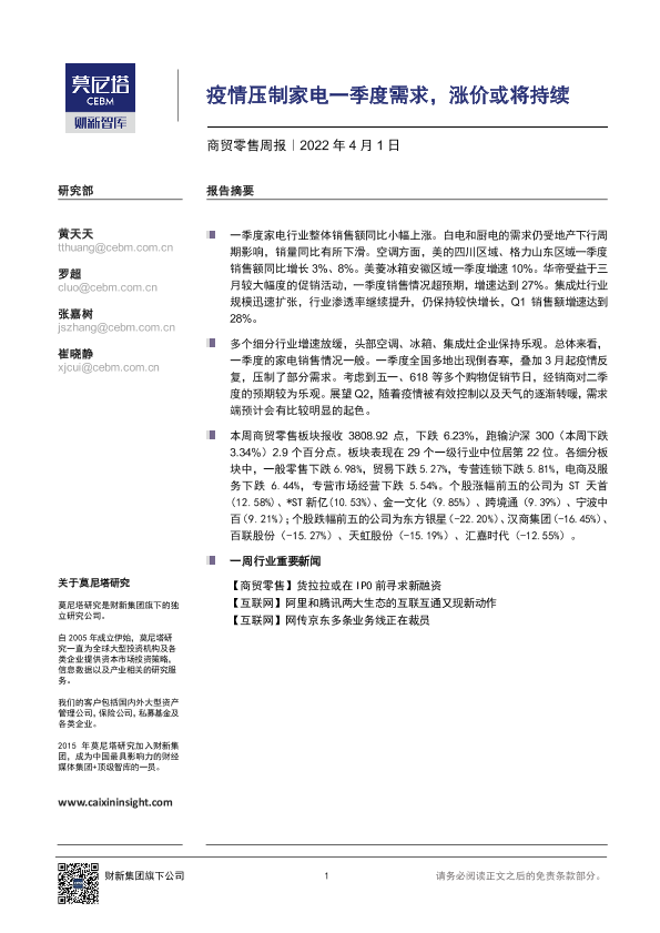 【莫尼塔研究】【20220401】商贸零售周报:疫情压制家电一季度需求,涨价或将持续-6页