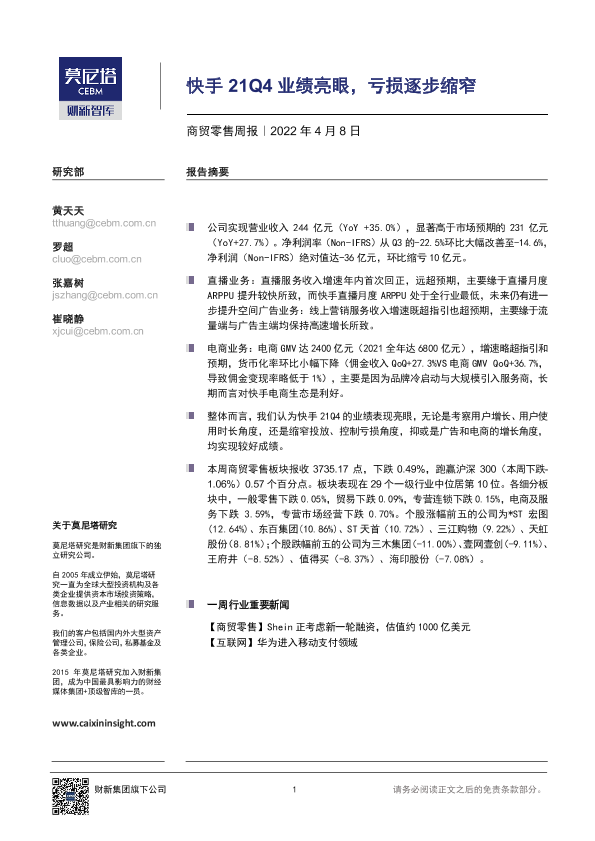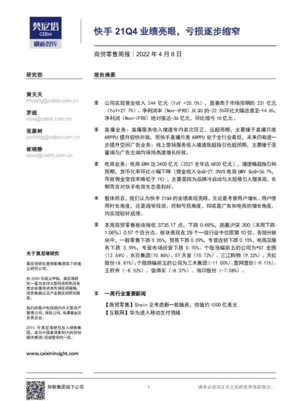【莫尼塔研究】【20220410】商贸零售周报:快手21Q4业绩亮眼,亏损逐步缩窄-6页