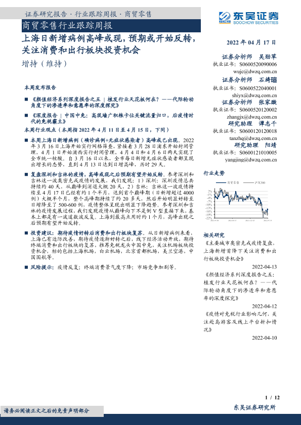 【东吴证券】【20220417】商贸零售行业跟踪周报:上海日新增病例高峰或现,预期或开始反转,关注消费和出行板块投资机会-12页