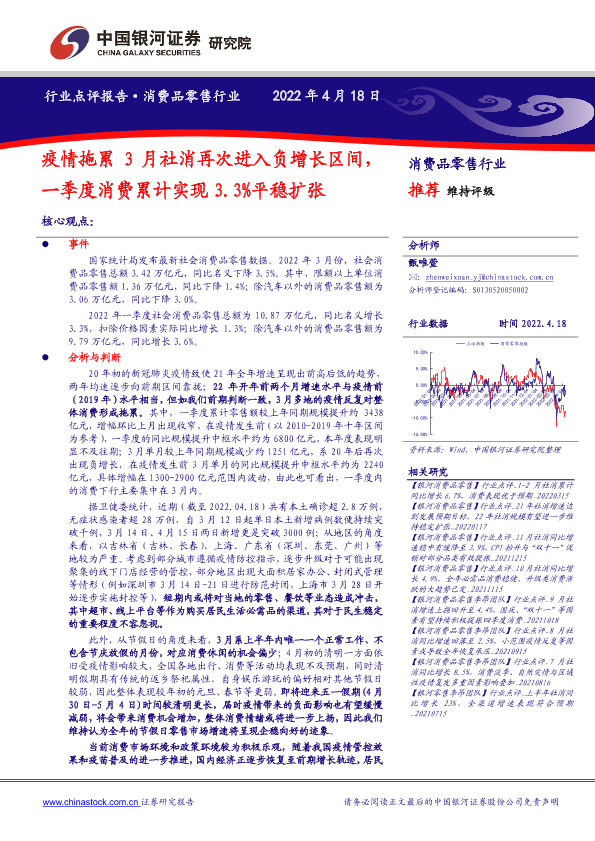 【银河证券】【20220418】疫情拖累3月社消再次进入负增长区间,一季度消费累计实现3.3%平稳扩张-6页