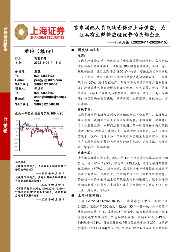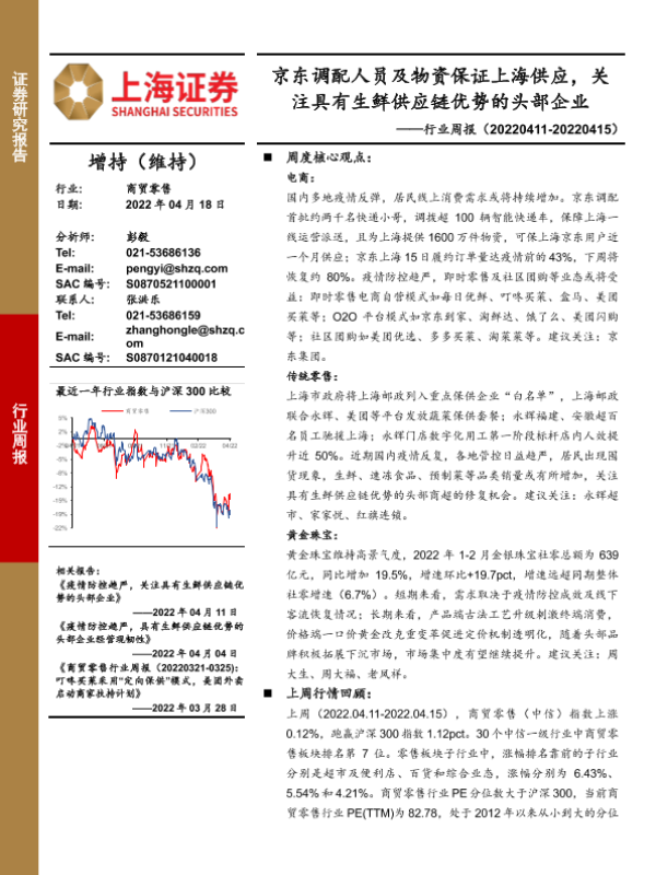 【上海证券】【20220418】商贸零售行业周报:京东调配人员及物资保证上海供应,关注具有生鲜供应链优势的头部企业-18页