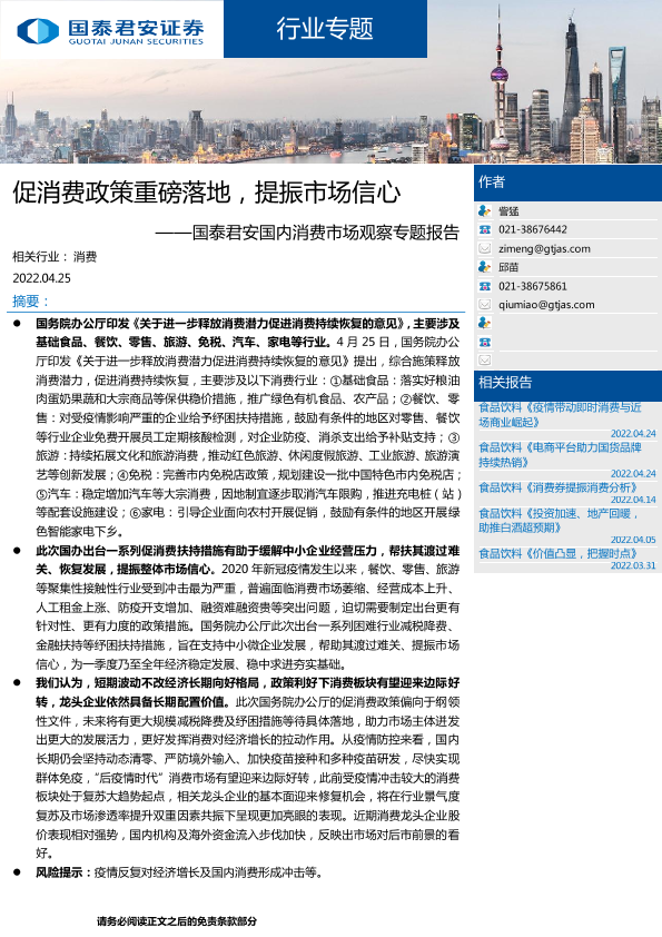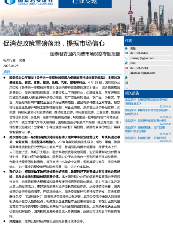 【国泰君安证券】【20220425】促消费政策重磅落地,提振市场信心-2页