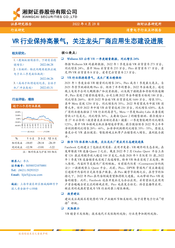 【湘财证券】【20220429】消费电子行业点评报告:VR行业保持高景气,关注龙头厂商应用生态建设进展-3页