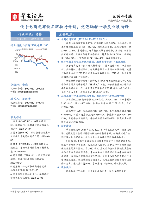 【华安证券】【20220504】互联网传媒行业周报:快手电商发布快品牌扶持计划,泡泡玛特一季度业绩向好-20页