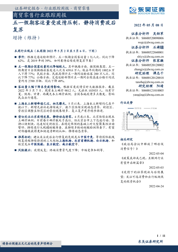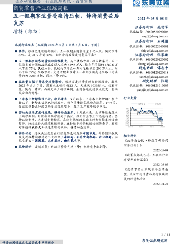 【东吴证券】【20220508】商贸零售行业跟踪周报:五一假期客运量受疫情压制,静待消费疫后复苏-11页