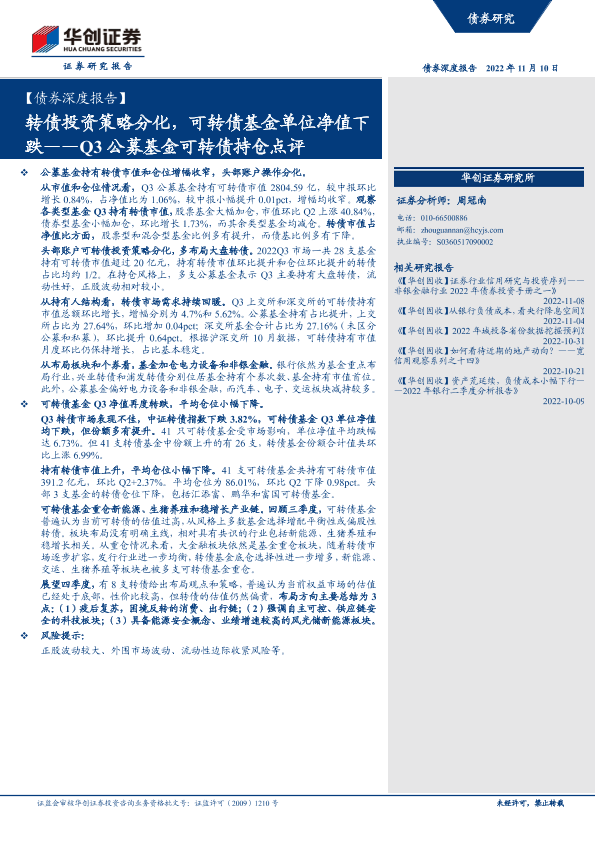 【华创证券】【20221110】Q3公募基金可转债持仓点评:转债投资策略分化,可转债基金单位净值下跌-22页