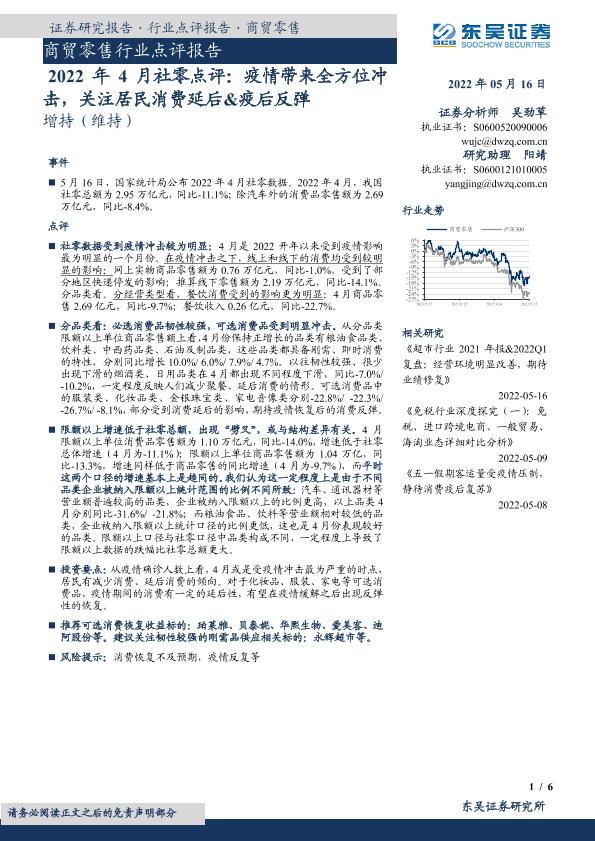 【东吴证券】【20220516】2022年4月社零点评:疫情带来全方位冲击,关注居民消费延后&疫后反弹-6页