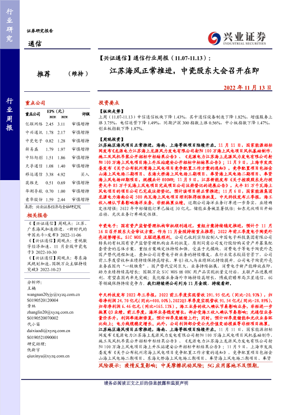 【兴业证券】【20221113】【兴证通信】通信行业周报:江苏海风正常推进,中瓷股东大会召开在即-20221113-兴业证券-17页.pdf-17页