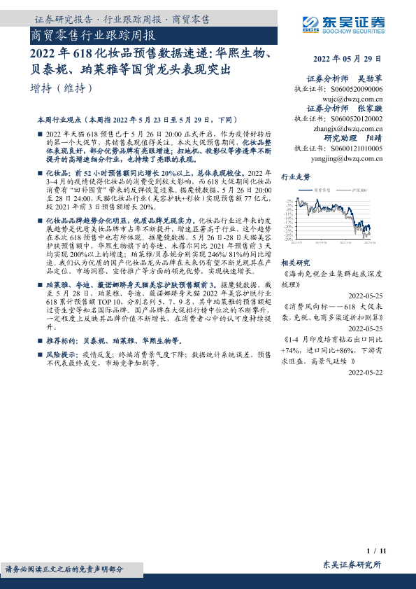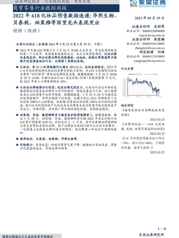 【东吴证券】【20220529】2022年618化妆品预售数据速递:华熙生物、贝泰妮、珀莱雅等国货龙头表现突出-11页