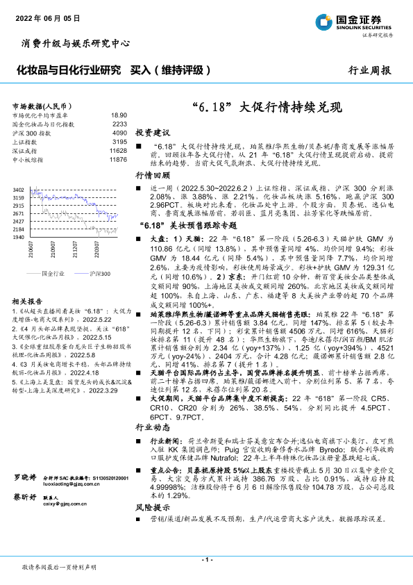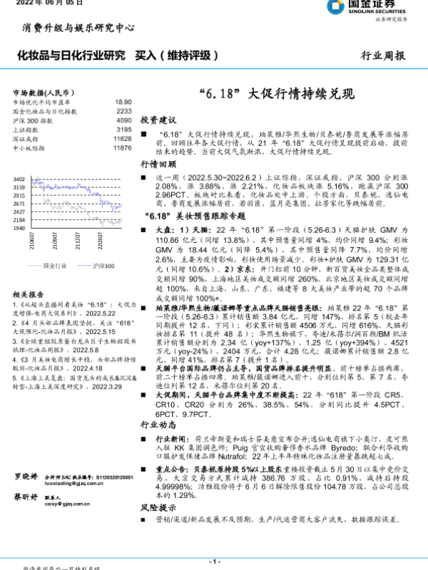 【国金证券】【20220605】化妆品与日化行业研究:“6.18”大促行情持续兑现-13页