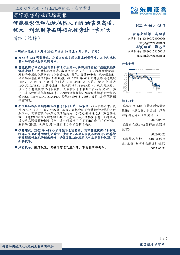 【东吴证券】【20220605】商贸零售行业跟踪周报:智能投影仪和扫地机器人618预售额高增,极米,科沃斯等品牌领先优势进一步扩大-9页
