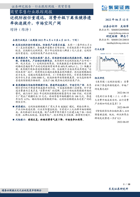 【东吴证券】【20220612】商贸零售行业跟踪周报:近视防控任重道远,消费升级下离焦镜渗透率快速提升,市场空间广阔-10页