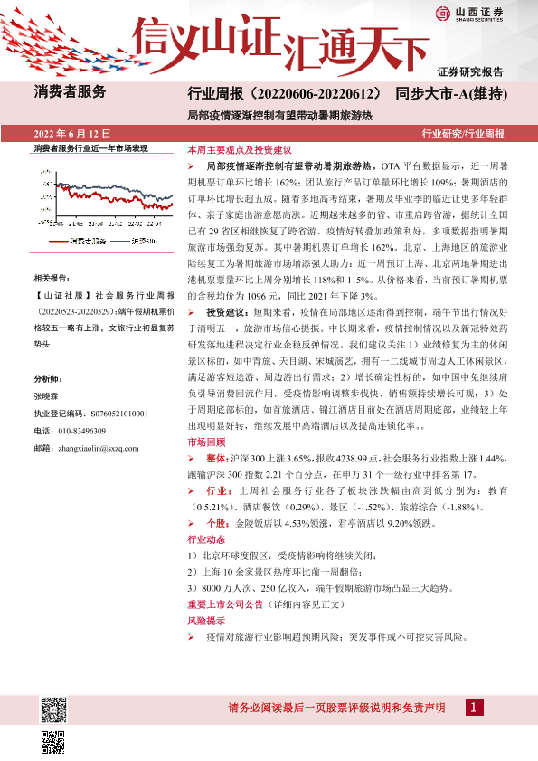 【山西证券】【20220612】消费者服务行业周报:局部疫情逐渐控制有望带动暑期旅游热-11页