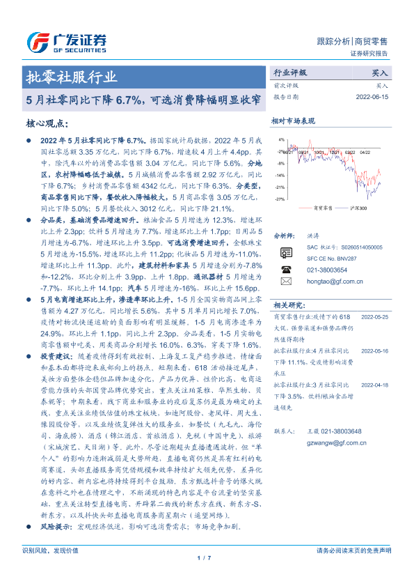【广发证券】【20220615】5月社零同比下降6.7%,可选消费降幅明显收窄-7页