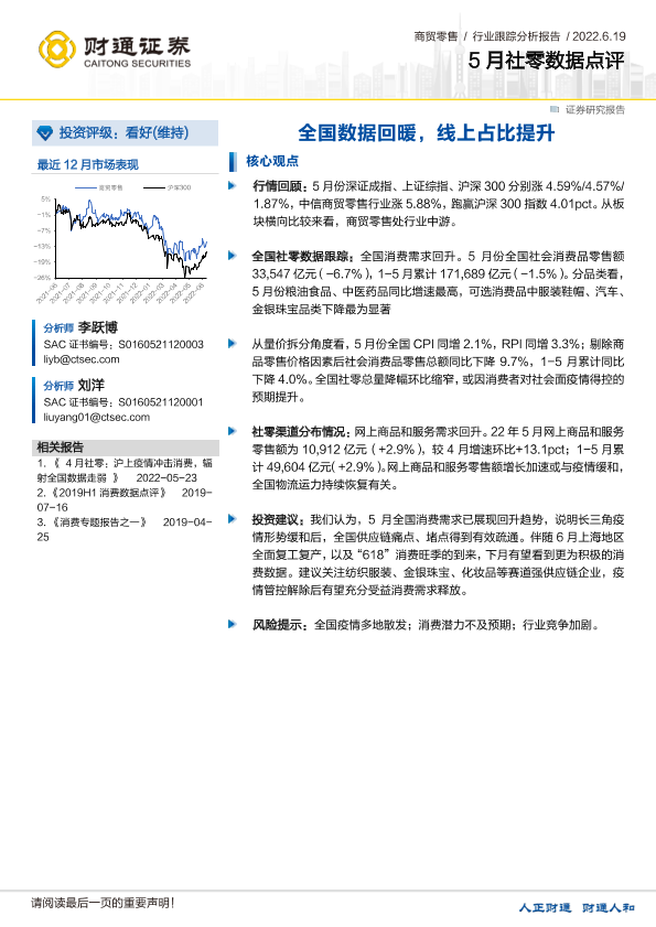 【财通证券】【20220619】5月社零数据点评:全国数据回暖,线上占比提升-6页