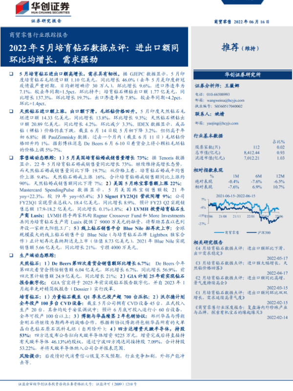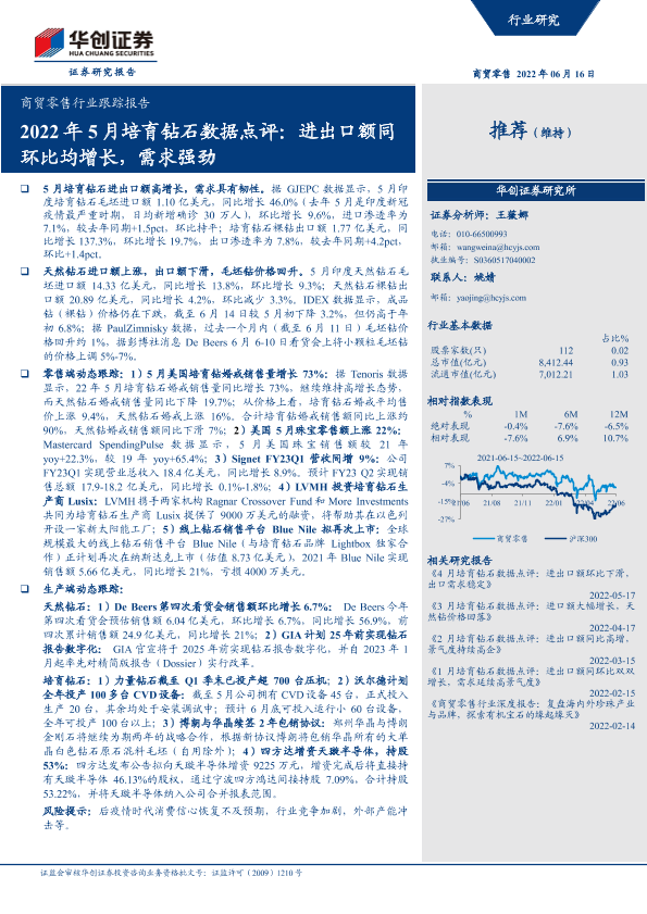【华创证券】【20220616】2022年5月培育钻石数据点评:进出口额同环比均增长,需求强劲-9页