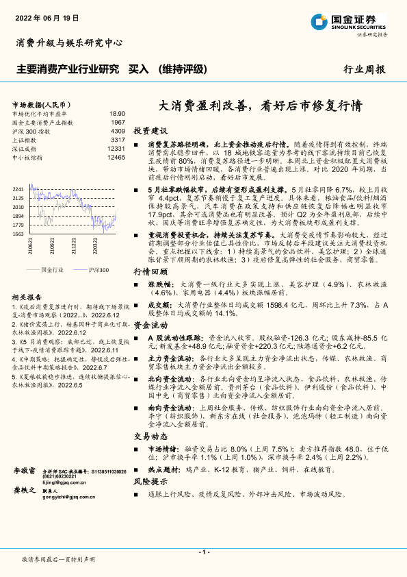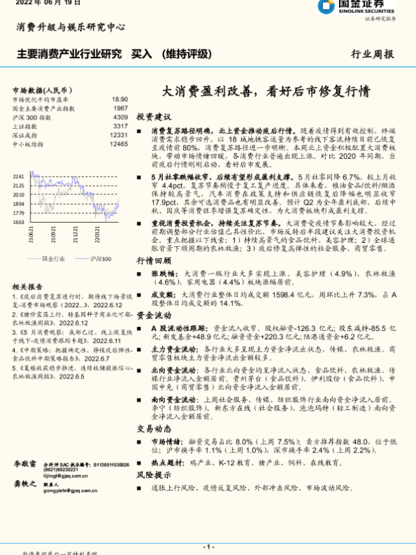【国金证券】【20220619】主要消费产业行业研究:大消费盈利改善,看好后市修复行情-18页