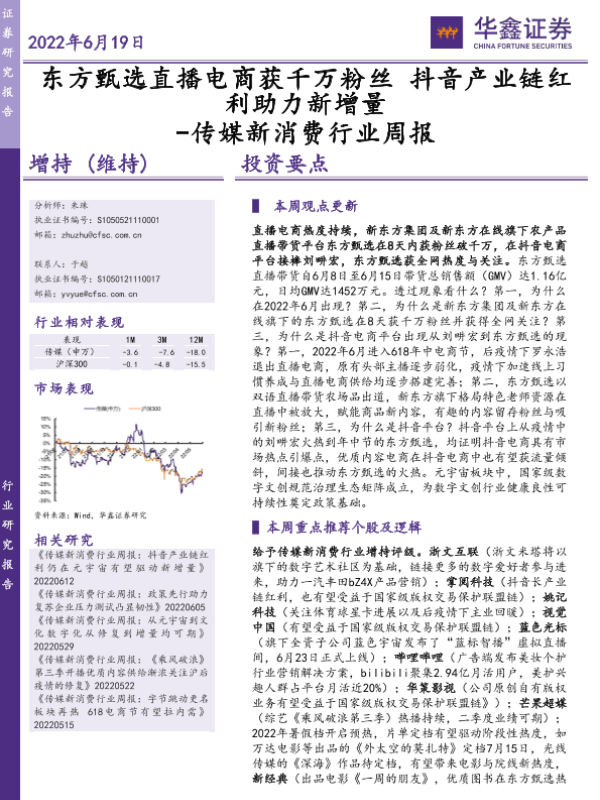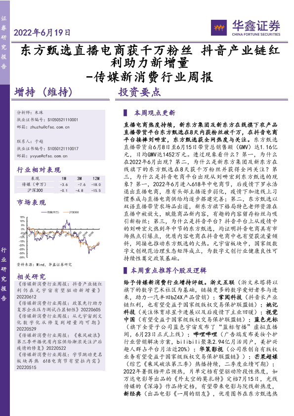 【华鑫证券】【20220619】传媒新消费行业周报:东方甄选直播电商获千万粉丝 抖音产业链红利助力新增量-20页