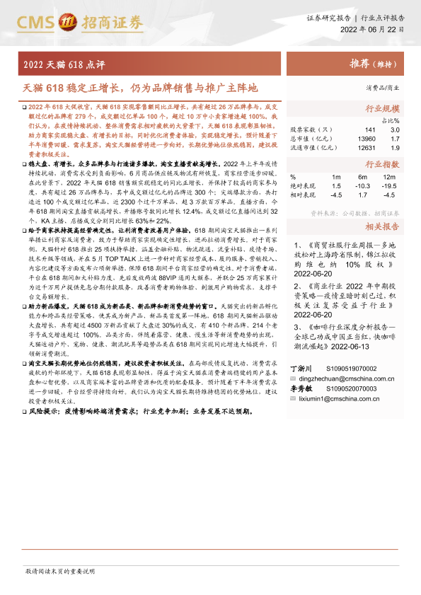 【海通证券】【20220622】商业2022天猫618点评:天猫618稳定正增长,仍为品牌销售与推广主阵地-2页