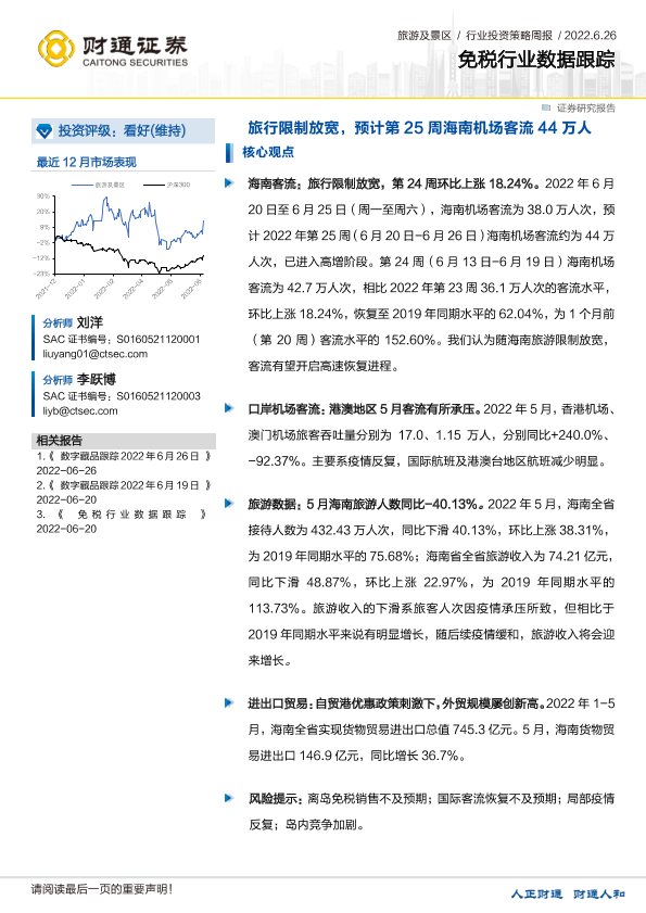 【财通证券】【20220626】免税行业数据跟踪:旅行限制放宽,预计第25周海南机场客流44万人-13页