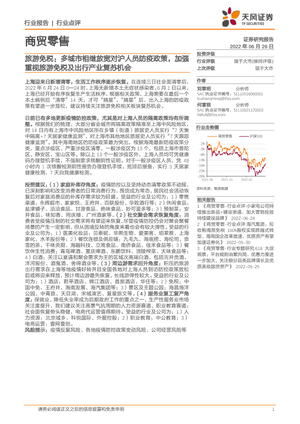 【天风证券】【20220626】多城市相继放宽对沪人员防疫政策,加强重视旅游免税及出行产业复苏机会-6页