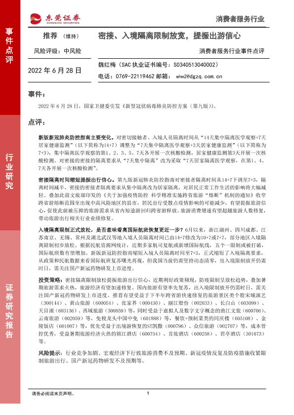 【东莞证券】【20220628】消费者服务行业事件点评:密接、入境隔离限制放宽,提振出游信心-2页