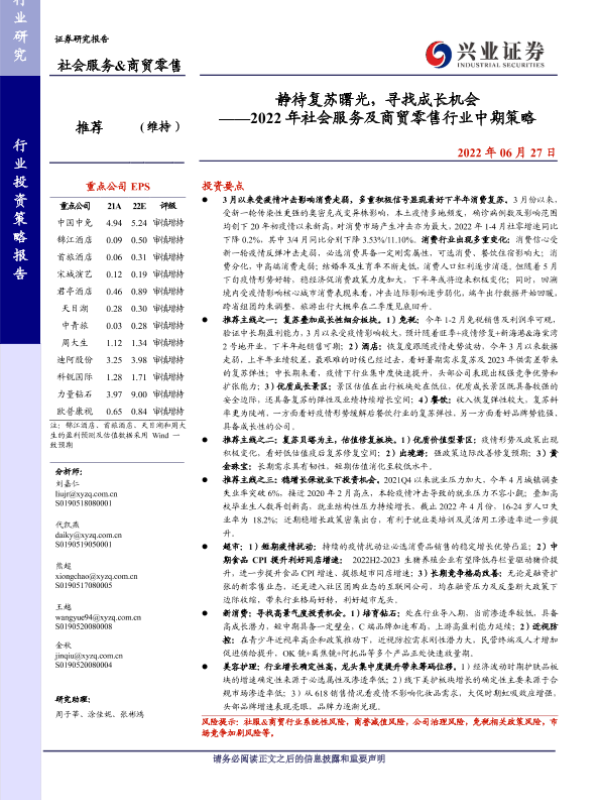 【兴业证券】【20220627】2022年社会服务及商贸零售行业中期策略:静待复苏曙光,寻找成长机会-75页
