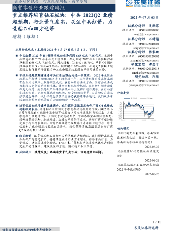 【东吴证券】【20220703】商贸零售行业跟踪周报:中兵2022Q2业绩超预期,行业景气度高,关注中兵红箭,力量钻石和四方达等-11页