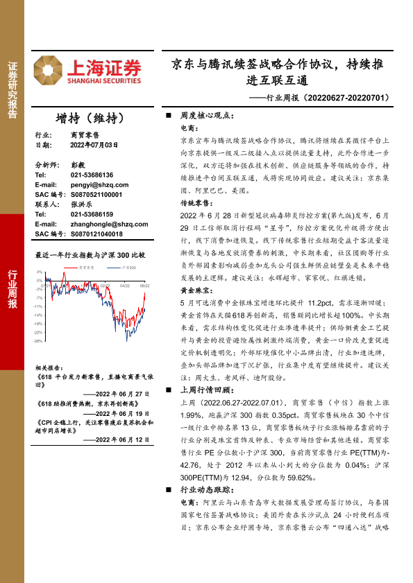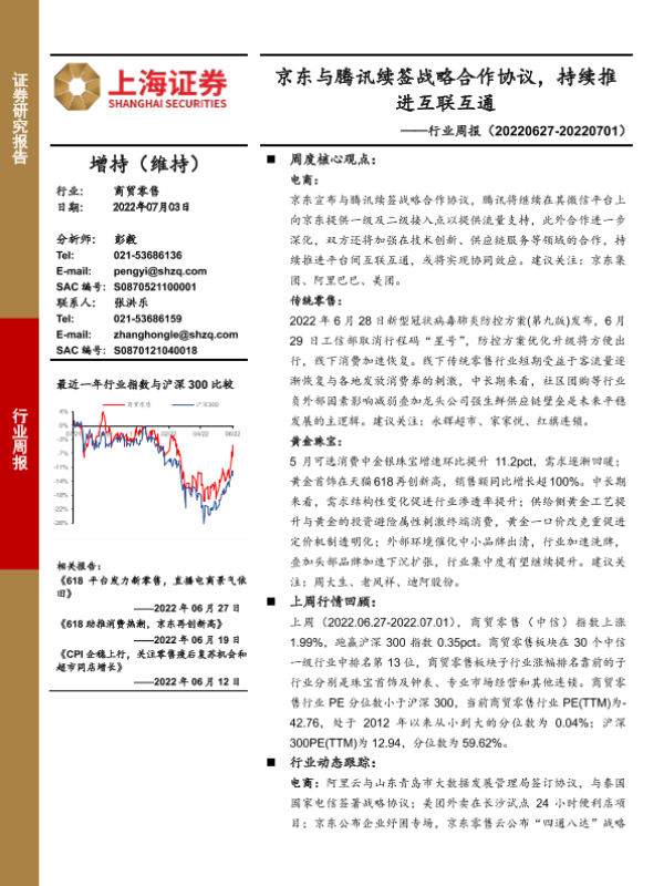 【上海证券】【20220703】商贸零售行业周报:京东与腾讯续签战略合作协议,持续推进互联互通-11页